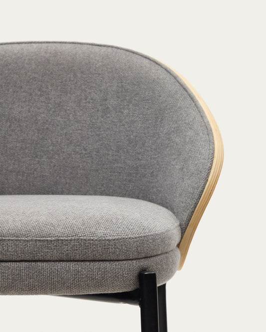 Eamy stool light grey chenille and ash wood veneer with a natural finish and black metal, 77 cm
