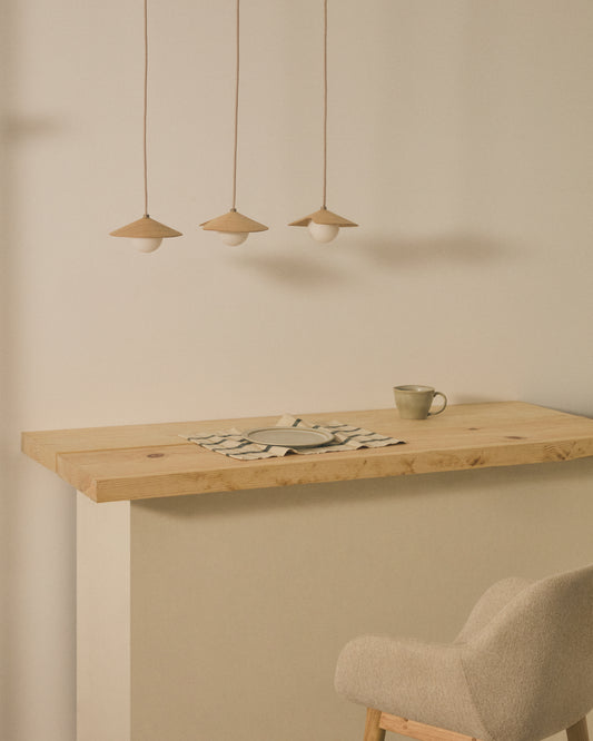 - Oak veneer ceiling lamp with three white smoked glass balls.