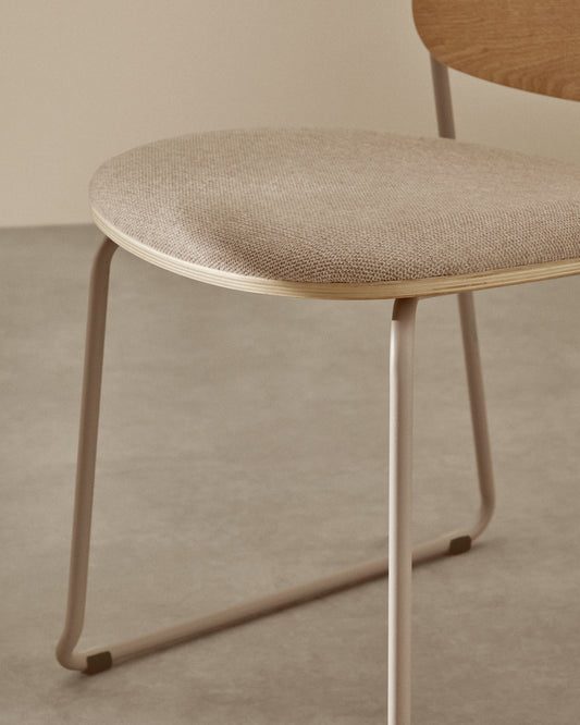 Meli stackable chair in poplar plywood with beige chenille seat and beige metal legs FSC Mix Credit