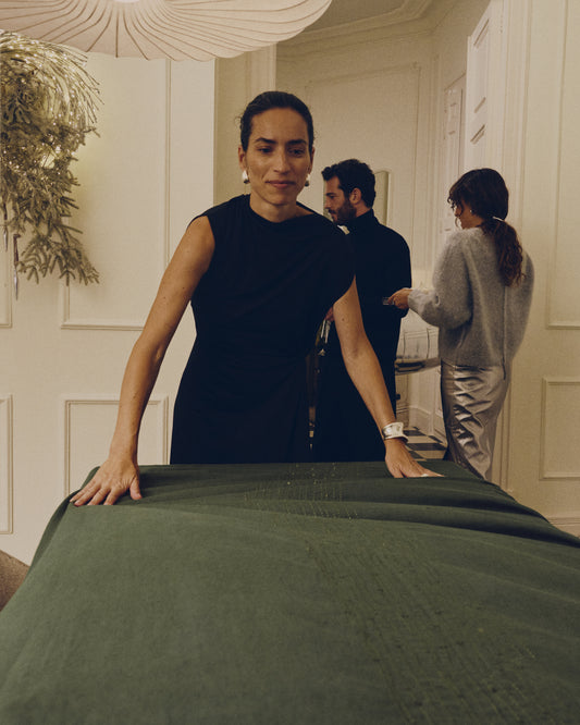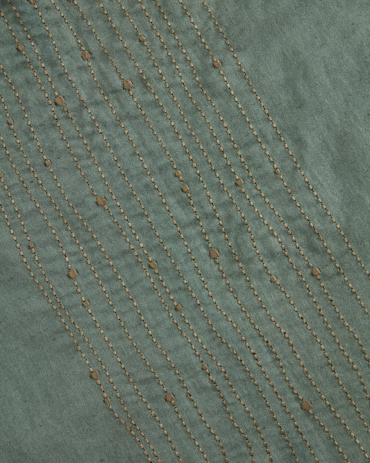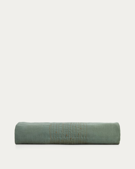 Flia green linen and cotton tablecloth with green lurex embroidery detail 150 x 250cm