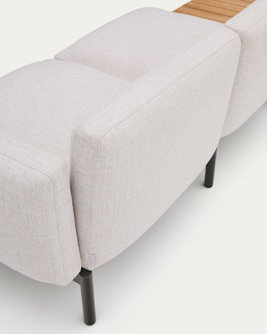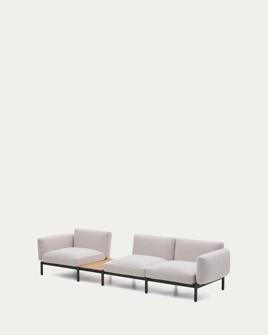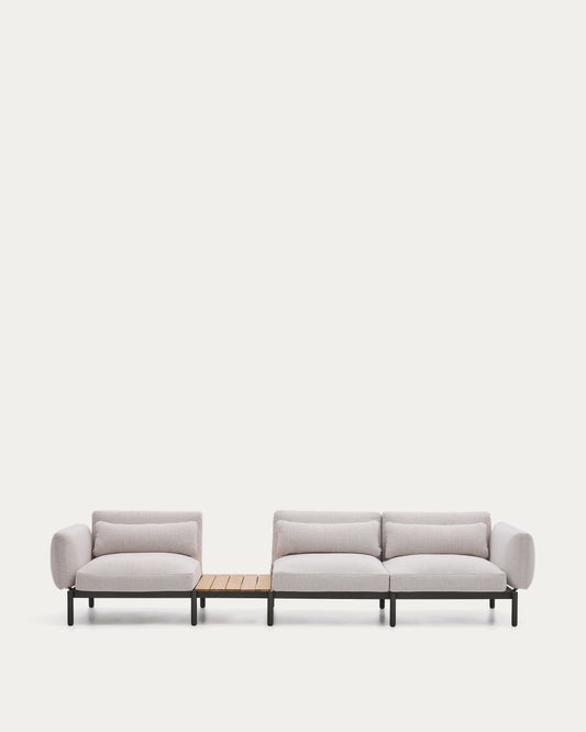 - 3-seater modular outdoor sofa with beige upholstery and grey aluminium structure. With integrated teak slatted table.