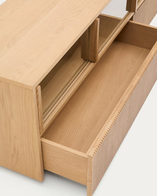 - TV stand made of oak veneer and tempered glass.