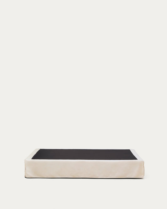 The base with removable cover is designed for comfort and practicality with an elegant finish. Its structure incorporates an upholstered base, so it does not require a bed base, providing firmness and stability for the mattress. The cover, made from high-quality, thick chenille, has a velvety feel and a stain-resistant treatment for easy care. The fabric is OEKO-TEX® STANDARD 100 certified, which guarantees safe and environmentally friendly production. Manufactured locally in Europe using responsible processes, this base contributes to reducing CO₂ emissions and features a durable, functional design with attention to every detail.