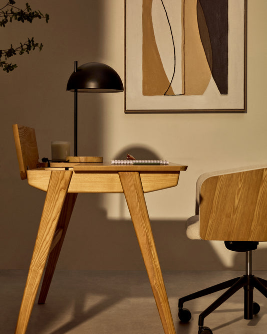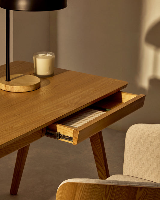 - Table with an MDF top veneered in mango wood and solid ash wood legs.