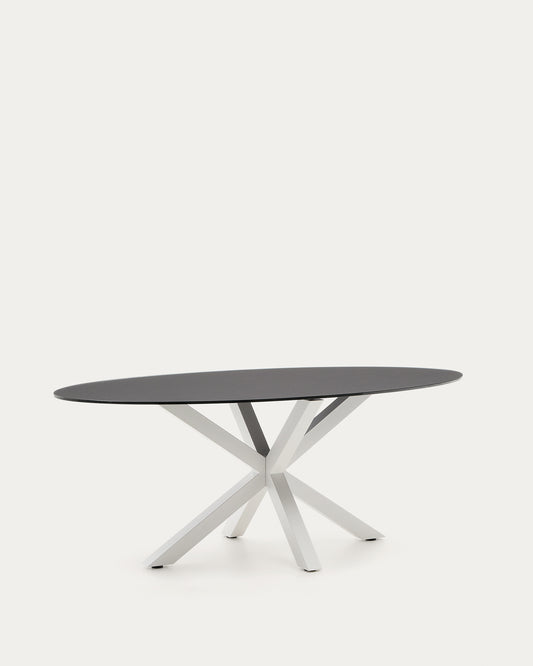 Argo oval table in matt black glass and steel legs with white finish Ø 200 x 100 cm