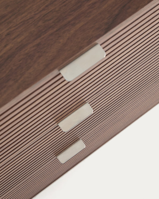 Norlen pays homage to 1950s design with a contemporary twist, fusing minimalist shapes and vintage details. The gently rounded corners and wooden base evoke a nostalgic air reinterpreted with pure lines and contemporary proportions. The darkened walnut veneer, applied by vacuum membrane press, fits perfectly to the radii of the furniture, unifying the finish and adding depth and character to each piece. It has a polyurethane varnish finish, which ensures resistance to wear and moisture. The structure of the furniture is made of MDF board and the interior panels are covered in melamine with a tonal finish, maintaining the coherence of the design. The handles are in brushed stainless steel with a satin finish, which reduces the visibility of fingerprints and scratches and ensures high resistance to corrosion. Their slanted design also makes them easy to grip when opening the door. It is also certified with the FSC Mix Credit label, so it is made with a mixture of materials from FSC-certified forests and FSC-controlled wood. Each element has been designed to provide functionality without sacrificing style. The furniture incorporates adjusters in the base for precise adjustment to any surface. A collection that transforms functionality into a style statement, made to last.