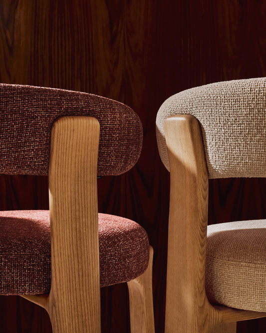 Granite stool made of beige chenille and solid ash wood with natural tone finish FSC 100% 75cm