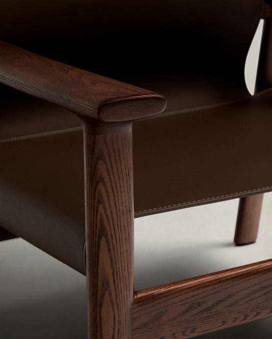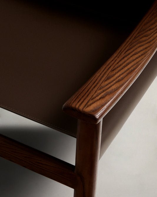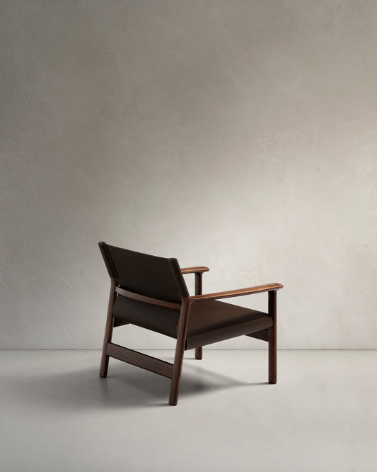 Jan armchair made of dark brown recycled leather fibres and FSC 100% solid ash wood with walnut-coloured finish
