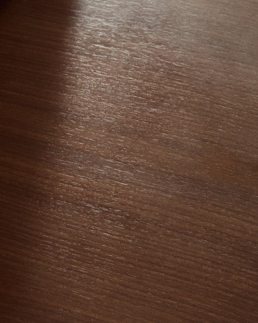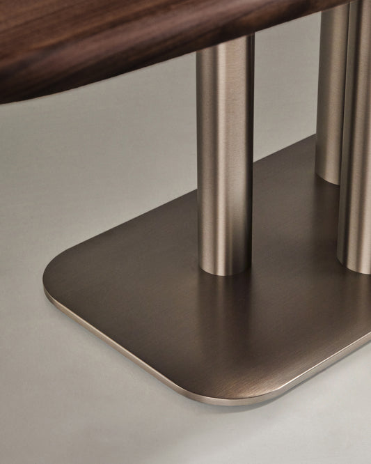 - Table with 0.6mm walnut veneer top with dark finish and legs of different diameters in stainless steel with brushed effect to reduce the visibility of fingerprints.
