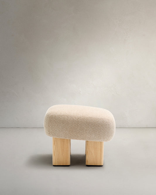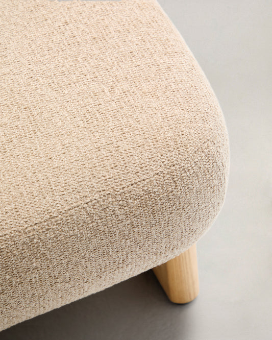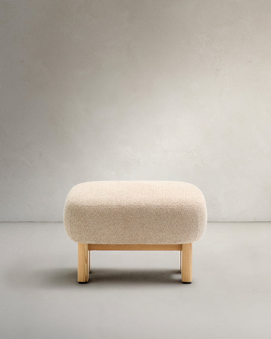 - Upholstered footstool with thick chenille fabric and solid ash wood structure in a natural finish.