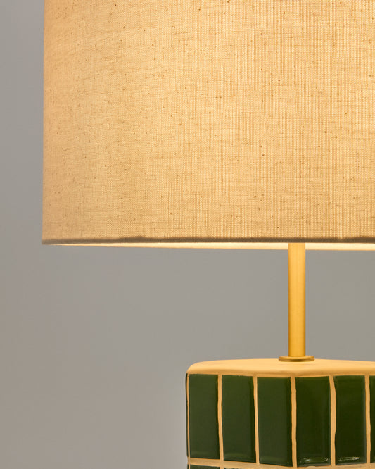 - Table lamp in painted ceramic emulating green tiles with an ecru fabric lamp shade.