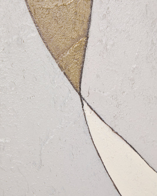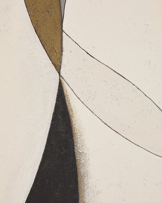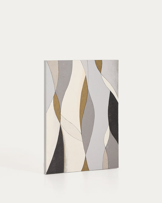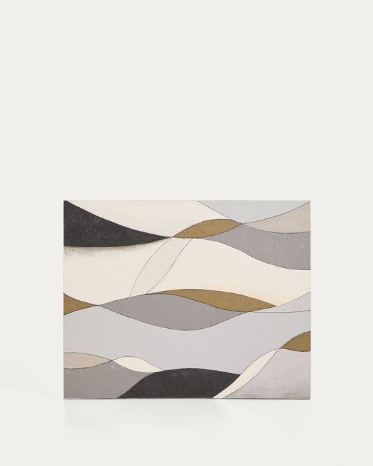 This abstract canvas in grey and mustard tones brings movement and sophistication to any environment. The play of soft lines and organic shapes intertwines to create a balanced composition, which conveys calm and elegance to the room. The shades of grey and mustard are combined with different intensities, achieving visual depth and facilitating integration into contemporary living rooms, bedrooms or offices.