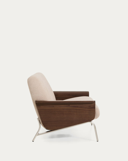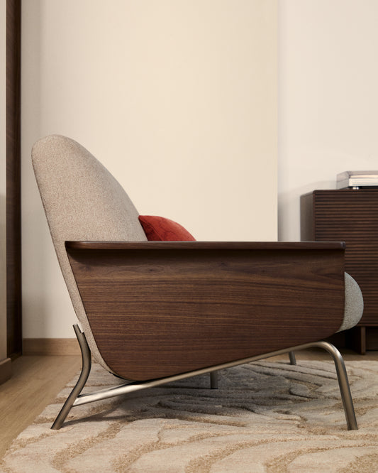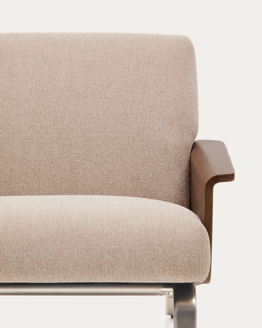 Amsen light brown 2-seater sofa in walnut plywood with brushed stainless steel legs 150cm