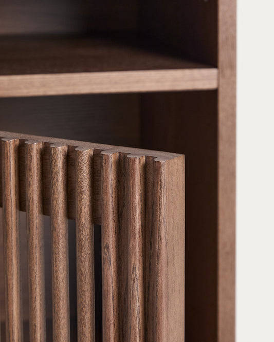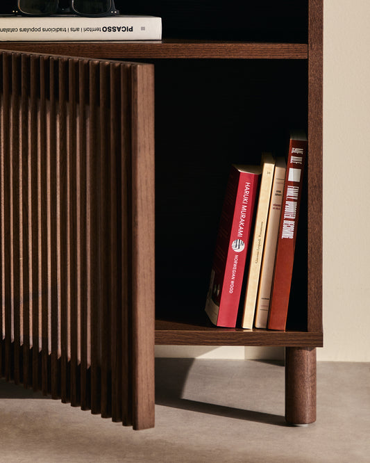 - Bedside table with ash veneer body, and door and legs in solid ash wood with a walnut-coloured finish.