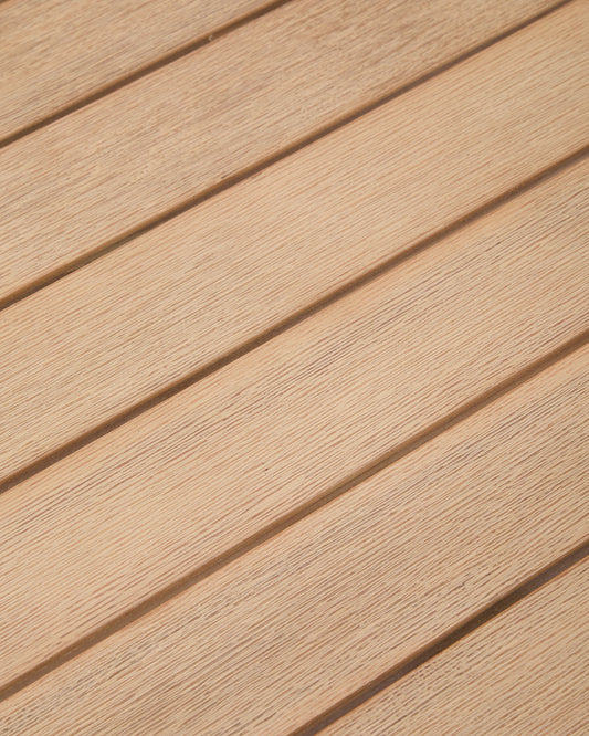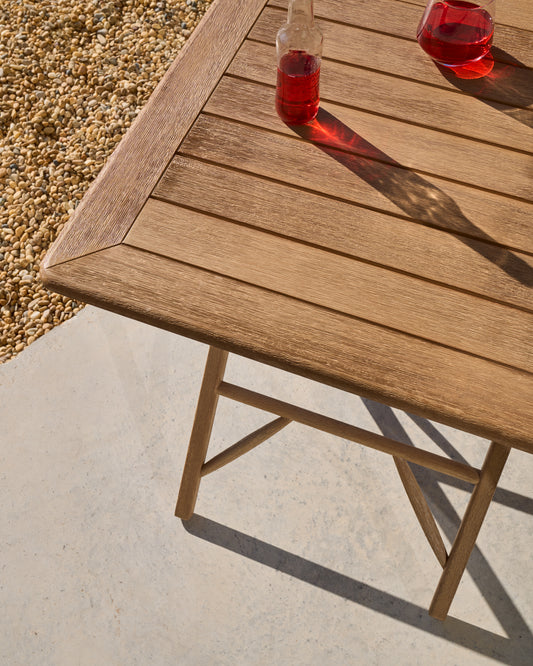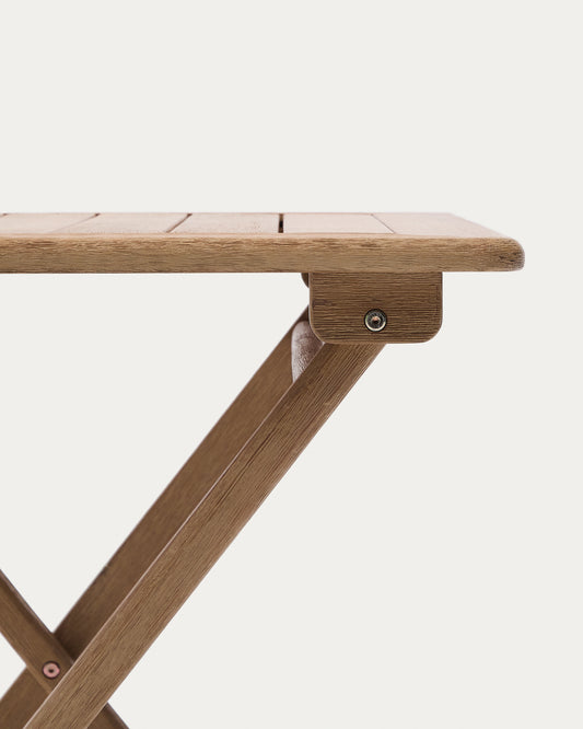 The Dandara table is the perfect solution for those looking for functionality and style in small spaces. Its folding design allows for quick and easy storage, optimising available space and facilitating its use only when needed. Whether on balconies, terraces or patios, Dandara adapts easily to any outdoor environment. Made from a combination of solid acacia wood and a steel structure with anti-rust treatment, this table offers great resistance and stability. The FSC™ 100% chain of custody certified acacia wood guarantees its controlled origin and responsible forest management, bringing added value to the piece. Its specially treated steel structure ensures maximum durability against humidity and exposure to the elements, making it a reliable and durable outdoor option. To ensure its optimal condition over time, we recommend applying the Sterina wood protector at least once a year. This simple maintenance preserves its appearance and ensures that it retains its properties for a long time.