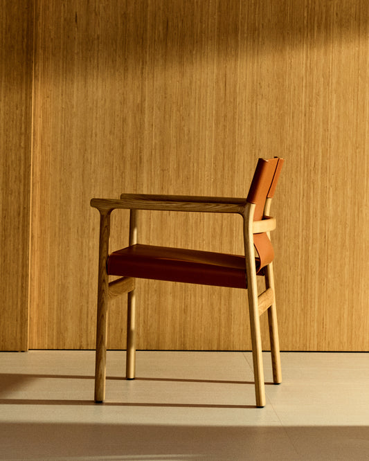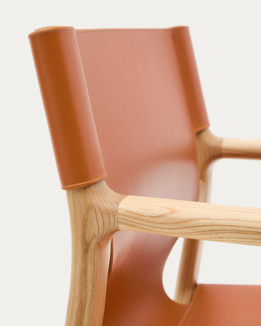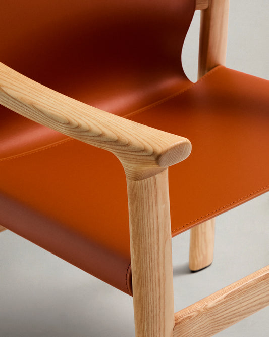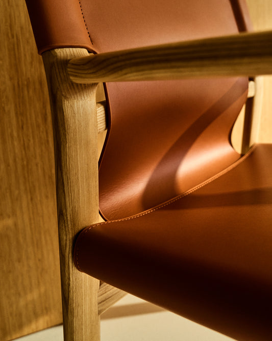 Jan chair made of light brown recycled leather fibres and FSC 100% solid ash wood with natural tone finish