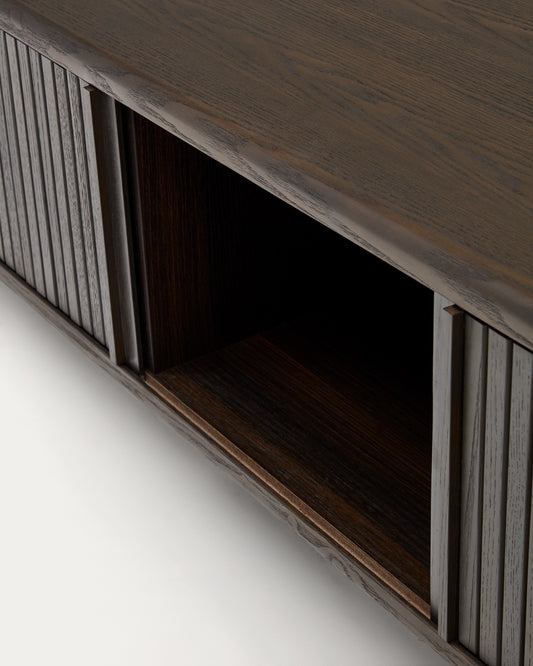 - TV stand made of ash veneer with dark finish.