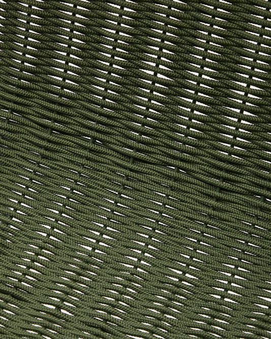 - Hand-woven Seat and backrest made with hand-woven, UV-resistant mottled green rope cord.