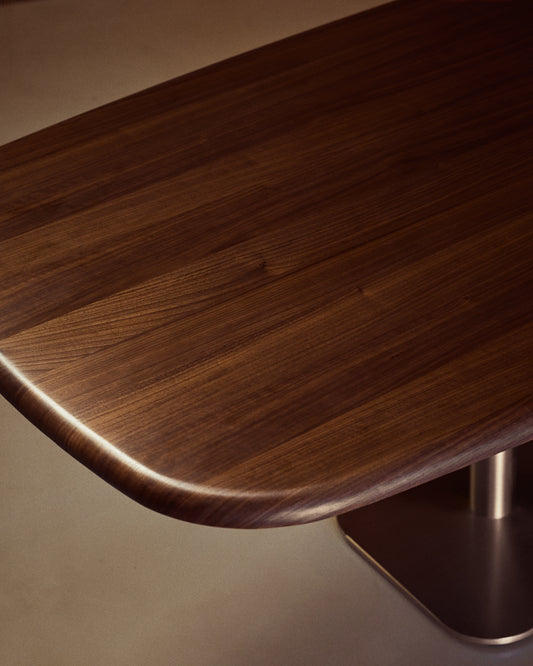 - Table with 0.6mm walnut veneer top with dark finish and legs of different diameters in stainless steel with brushed effect to reduce the visibility of fingerprints.