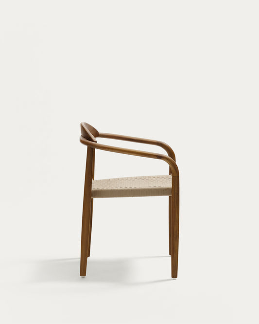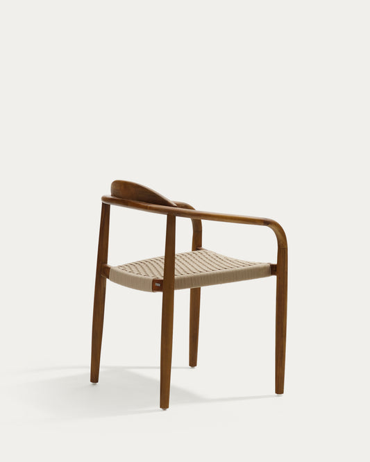 Nina stackable chair in FSC 100% solid acacia wood with walnut finish and beige rope seat