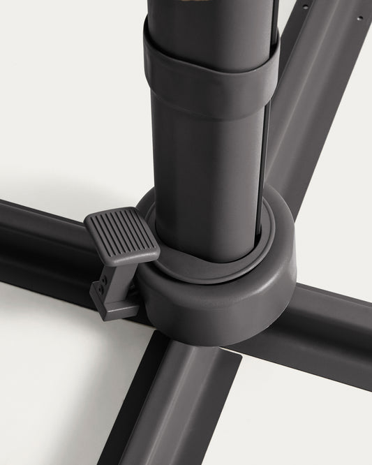 The Noli cantilever parasol offers ample and adjustable shade to enjoy the outdoors in total comfort. Its aluminium structure with articulated side arm allows the shade to be easily adjusted and frees up space under the parasol, integrating naturally into terraces and gardens. It can rotate 360° and tilt up to 90° to adapt to the sun’s path throughout the day. The crank-operated opening system make it comfortable and effortless to use. The fabric is made of polyester, with a weight of 200gsm and UV50+ protection capable of blocking up to 98% of UV radiation. A resistant material designed to last outdoors. For better preservation, we recommend protecting it with the Iria cover when not in use. The base is not included.