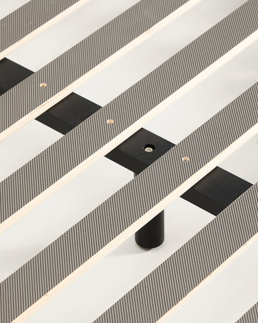 Norlen pays homage to 1950s design with a contemporary twist, fusing minimalist shapes and vintage details. The gently rounded corners and wooden base evoke a nostalgic air reinterpreted with pure lines and contemporary proportions. This base is solid and robust. It includes a bed base with 14 birch plywood slats, designed to offer you the perfect support and optimum ventilation for your mattress. The 9 solid birch wood legs, with an elegant round cross-section and walnut veneer-covered outer profile, ensure maximum stability and aesthetic continuity in the design, blending beauty and functionality in every detail. Wood with FSC Mix Credit certification, made from a mix of materials from FSC certified forests and FSC controlled wood. This bed is the ideal choice for those who are looking for the perfect balance of sophisticated design, technical innovation and maximum comfort in the bedroom.