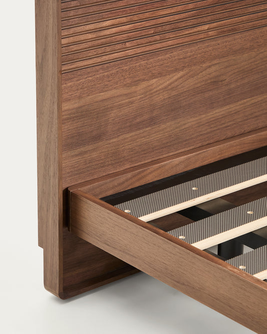 - Bed with headboard in walnut veneer with horizontal linear milling and LED light strip at the top.