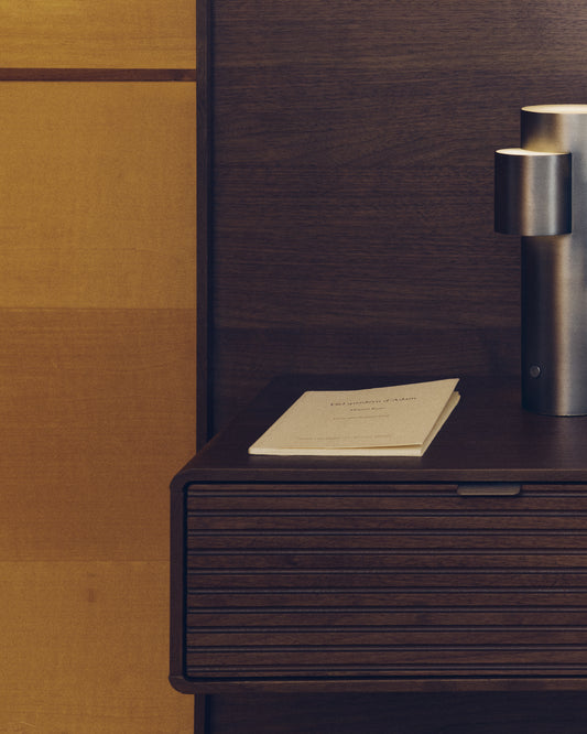 - Bed with headboard and two bedside tables in walnut veneer with horizontal linear milling and LED light strip at the top.