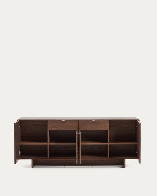 - Tall sideboard in 0.6 mm walnut veneer. 4 doors with soft-close hinges and 2 drawers with concealed runners, handle opening system and soft close.