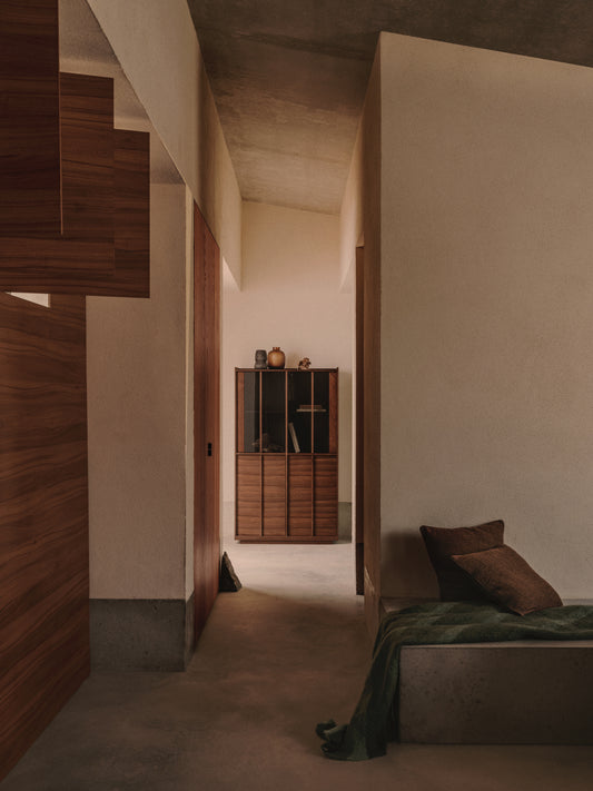 - Top part with tempered glass doors and shelves and the lower part with doors and shelves in a walnut veneer.