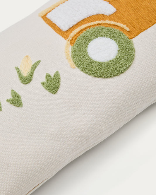 Pecky cushion cover in beige cotton with a tractor embroidery feature, 30 x 50 cm