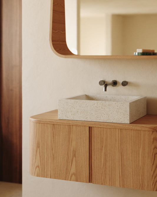 - Bathroom cupboard made of ash laminated plywood in a natural finish.