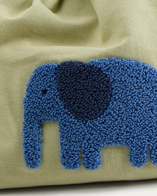 Tandani set of 2 beige and green cotton bags with embroidered blue elephant
