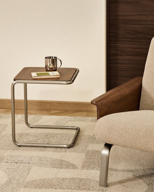 Tarsel side table in walnut veneer with brushed stainless steel structure 42 x 47cm